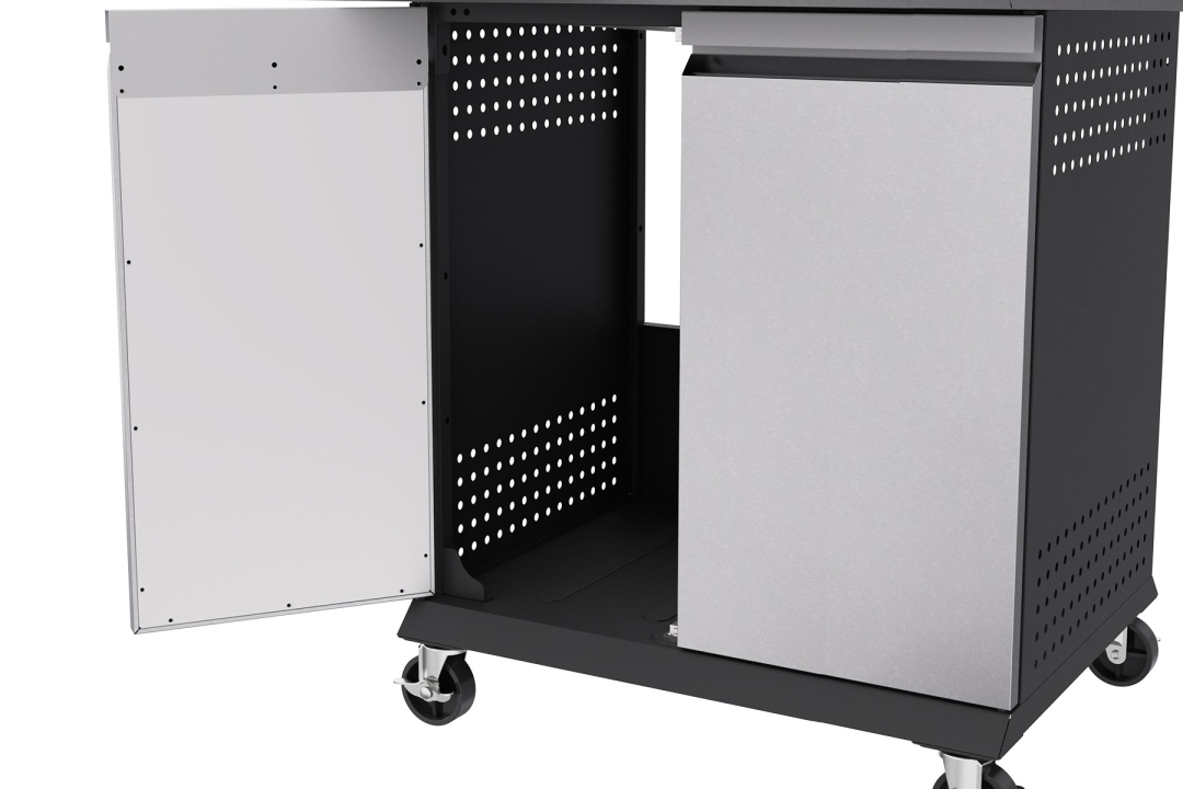 The cabinet with double-layer stainless steel door, brings durable construction and roomy storage. Four lockable casters make it easier to transport, and the brake system provides secure footing on the ground during grilling.