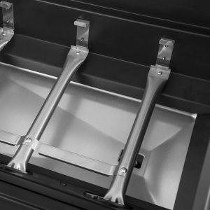 The lidded side burner with porcelain enamel coated pot rack, offering 2.5kW output, is perfect for cooking side dishes with a pot. The lid can be folded to function as side table for adding workspace. Durable side table with integrated hooks make it easy to hang grilling tools and accessories within arm's reach for hassle-free cooking.