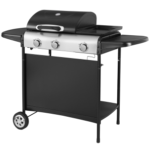 3 Burners Black Powder Coated Gas Grill with Double-layer Lid and Folding Side Tables